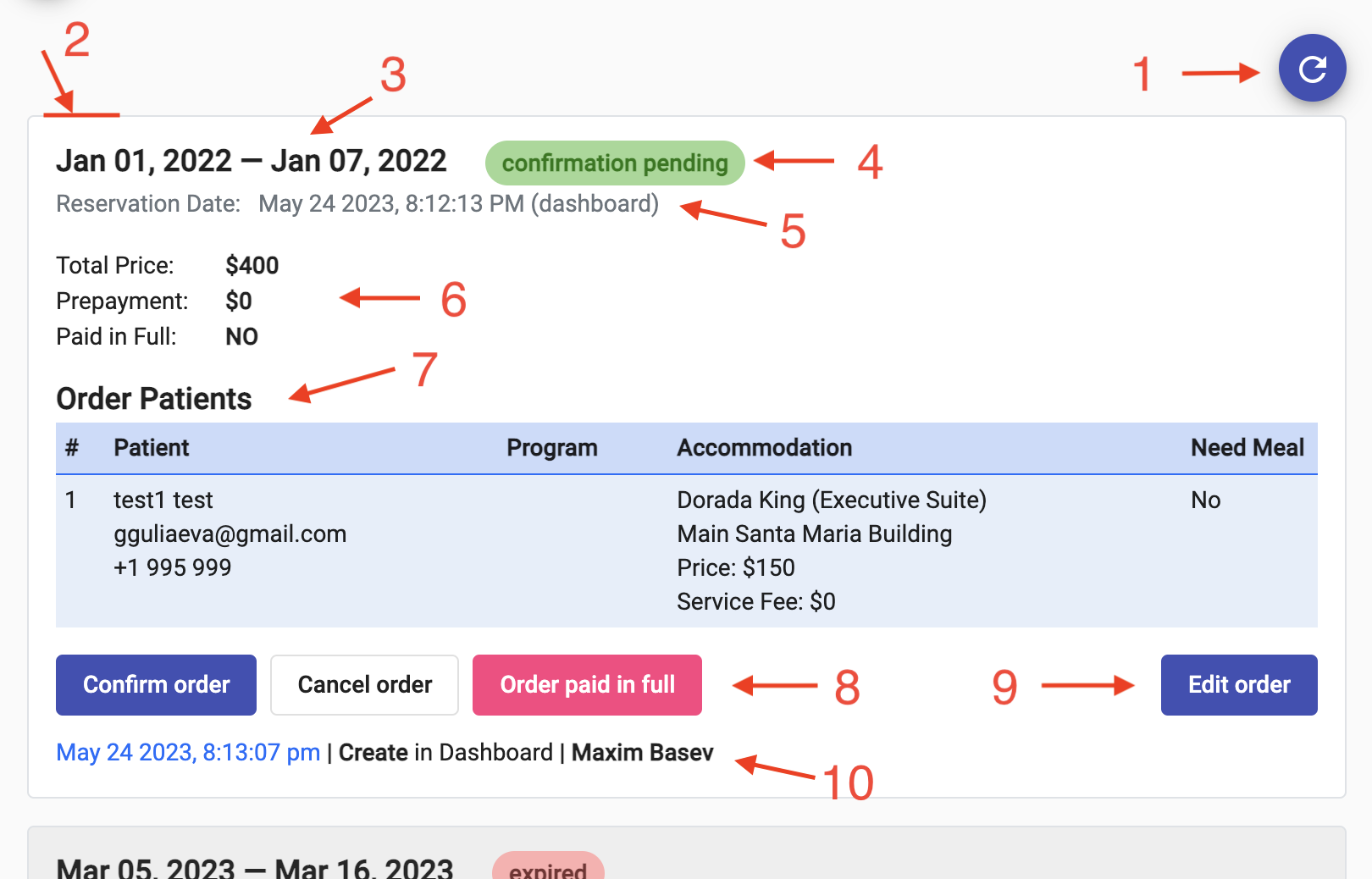 * Expired (order was placed, but payment was not made within an hour). Such an order can be changed to confirmed by editing the order and providing payment information (if the room specified in the order is already booked, it will need to be changed during editing).